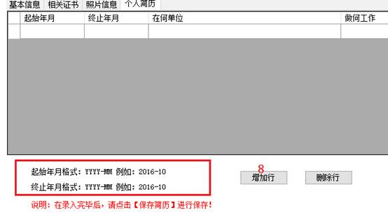 8、简历安装先后顺序录入,一般不超过5行,否则可能打印不全